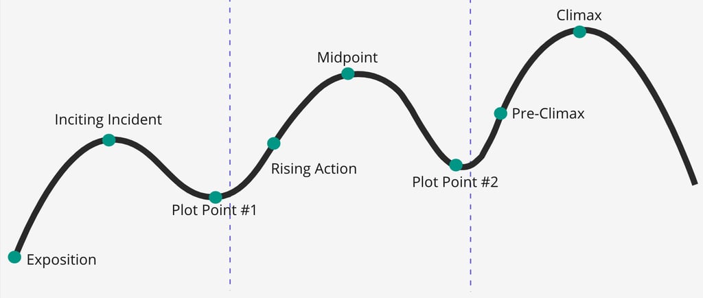 - Act 1 (25%): Sets up characters, setting, and inciting incident
